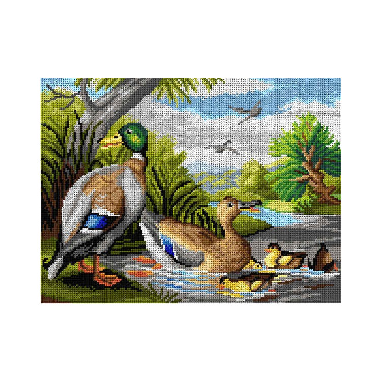 Kanavatyö Sorsat Joella 30×40 (2955J) on Orchidean hyvälaatuinen kanavatyö. Työ on painettu taiteilija Jacob Bogdanin työn Ducks in a River mukaan. Kanavatyö on painettu 100% puuvillakankaalle. Pakkauksessa laadukkaat villalangat (29 sävyä).