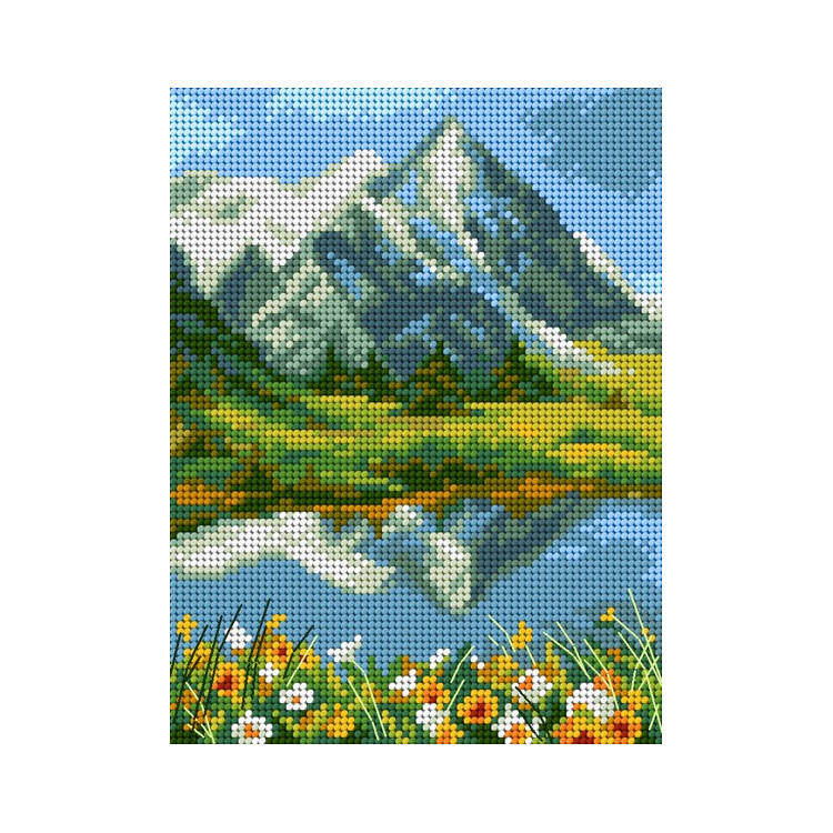 Työssä on kaunis kesäinen vuoristomaisema. Työ on painettu 100 %puuvillakankaalle. Pakkauksessa on laadukkaat villalangat.