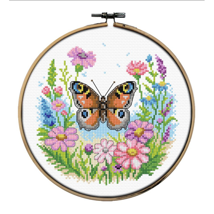 Tästä ristipistopakkauksesta valmistat ihanan kesäinen pienen taulun. Perhoset kuuluvat olennaisena osana Suomen kesään ja niitä onkin paljon erilaisia ihanuuksia. Tässä työssä on neitoperhonen kaikessa komeudessaan. Ympärillä erivärisiä pastellinsävyisiä niittykukkia.