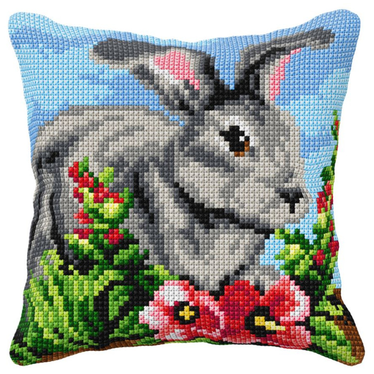 Tyynyssä on komea harmaa kani. Tausta sininen ja etuosassa on kauniita punaisia kukkia. Kiva tyynyn päällinen eläinten ystävälle. Sopii hyvin lastenhuoneeseen joko koristeeksi sängylle tai siitä voi kehystyttää taulun seinälle. Ja sehän on myös mitä ihastuttavin lahjaidea sekä valmiina, että myös käsityöpakkauksena.