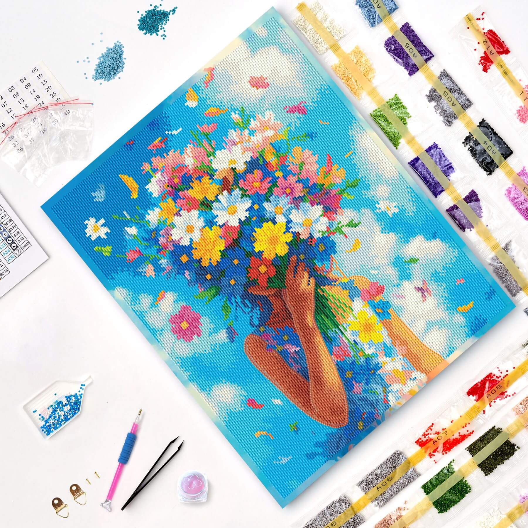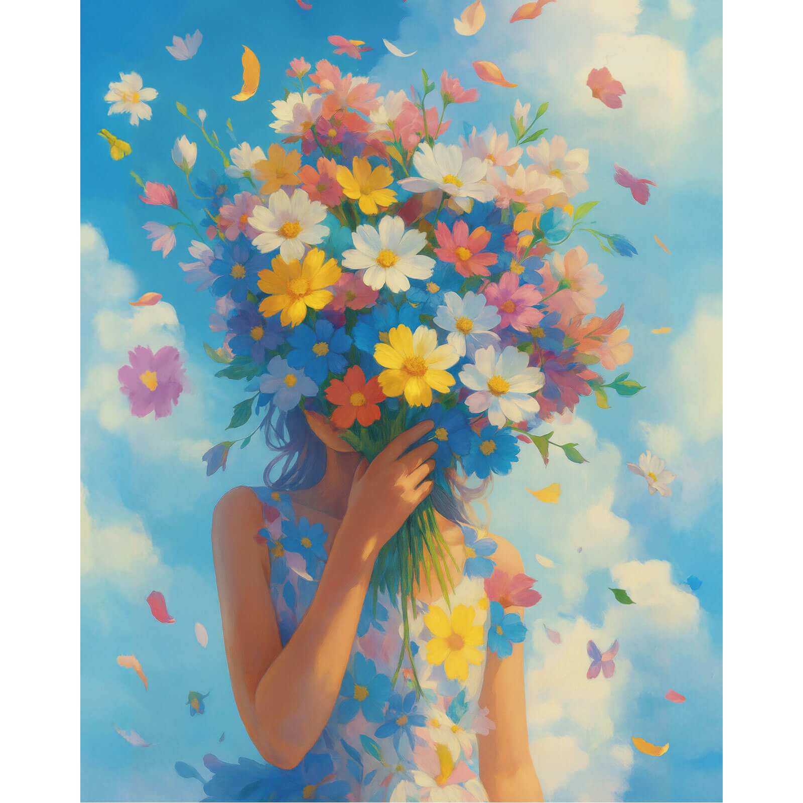 Työssä on 45 väriä: kuva on ihanan värikäs. Siinä on nainen ja kukkakimppu, jossa on tosi monen värisiä kukkia. Tausta on vaaleansininen ja siinä on valkoisia pilvenhattaroita. Työ on erittäin herkkä, vaikka on niin värikäs. Toimittajan suosituksen mukaan työ sopii yli 12 vuotiaille.
