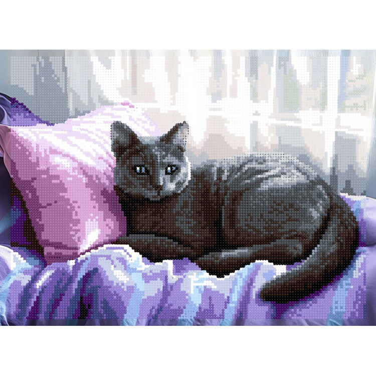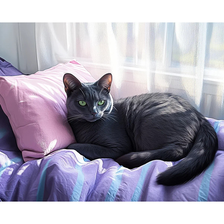 Kuvassa iso musta vihreäsilmäinen kissa loikoilemassa sängyn päällä. Sänky on ikkunan edessä, josta kajastaa auringonvalo. Ikkunan edessä on läpikuultava valkoinen verho. Sängyllä on violetti päiväpeitto ja vaaleanpunainen tyyny.