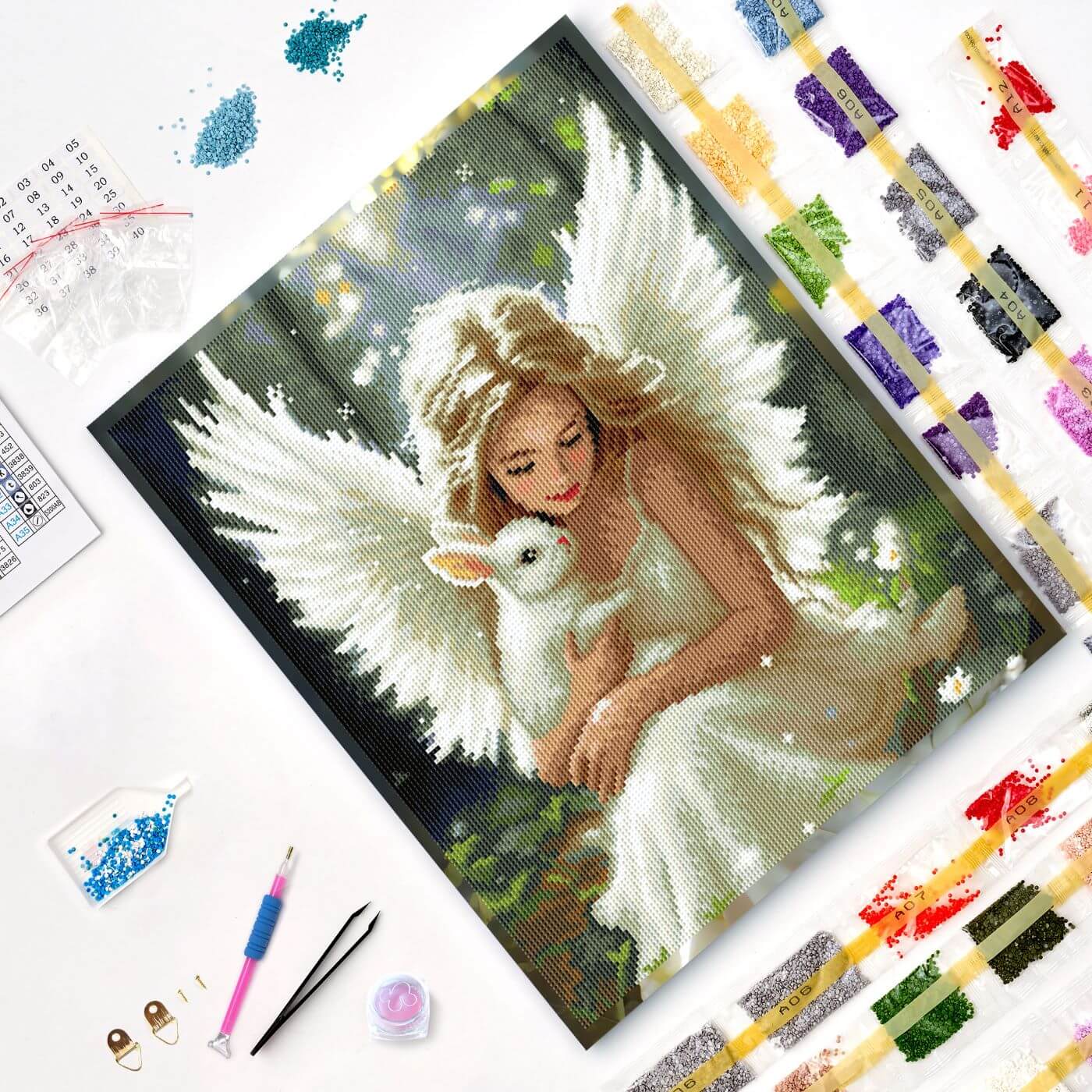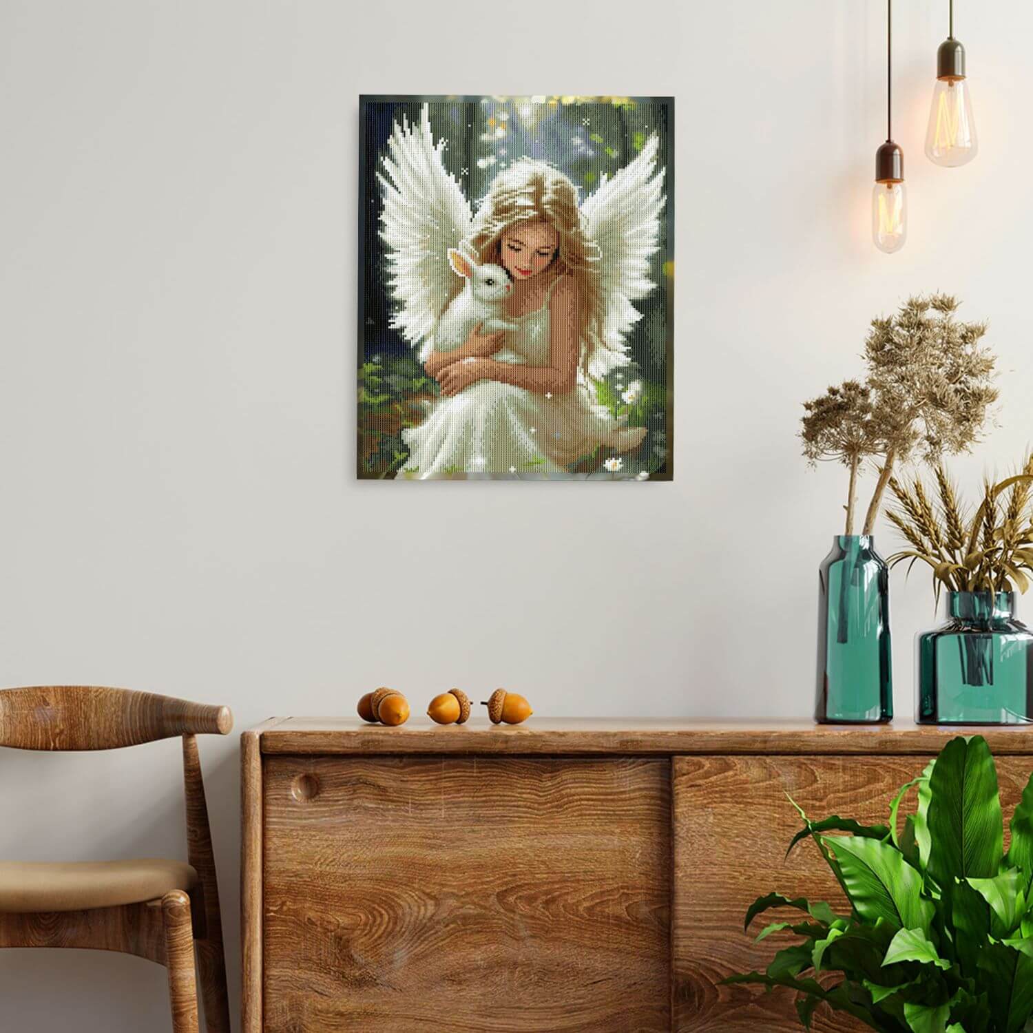 Kaunis enkeli timanttimaalaus. Työ on erittäin herkkä: enkeli on kauniskasvoinen, vaaleatukkainen tyttö. Hänellä on puhtaanvalkoinen puku ja valkoinen kani sylissä. Työssä on rauhallinen, seesteinen ja toiveikas tunnelma. Ihana enkeli timanttityö vaikkapa suojelusenkeli tauluksi perheen pienimmille.